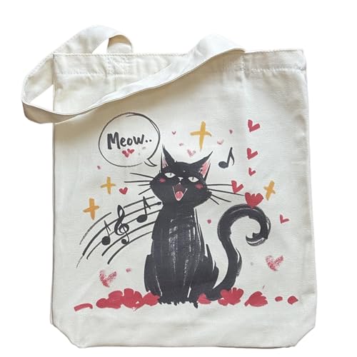 Canvas Tote Bag with Zipper for Women, Aesthetic Tote Bag with Pocket for Vacation, Shopping, Travel, Beach Cat Music-02
