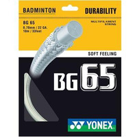 The Yonex BG 65 badminton racket string is the bestselling string, popular because of its durability and the additional control it adds to your game. This white 22 (0.70mm) gauge string comes in a 10m pack.