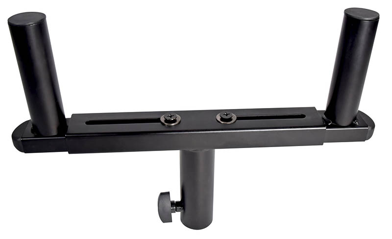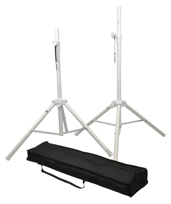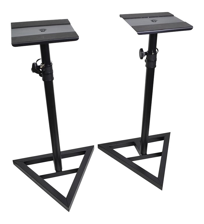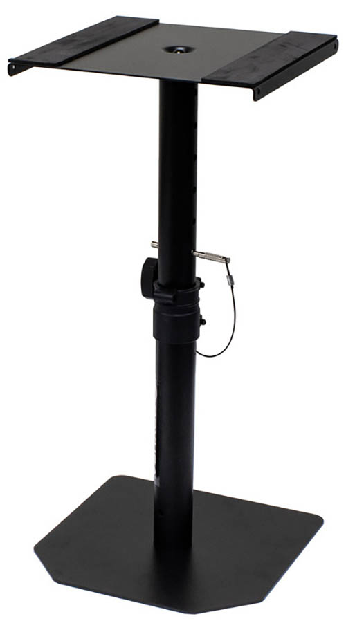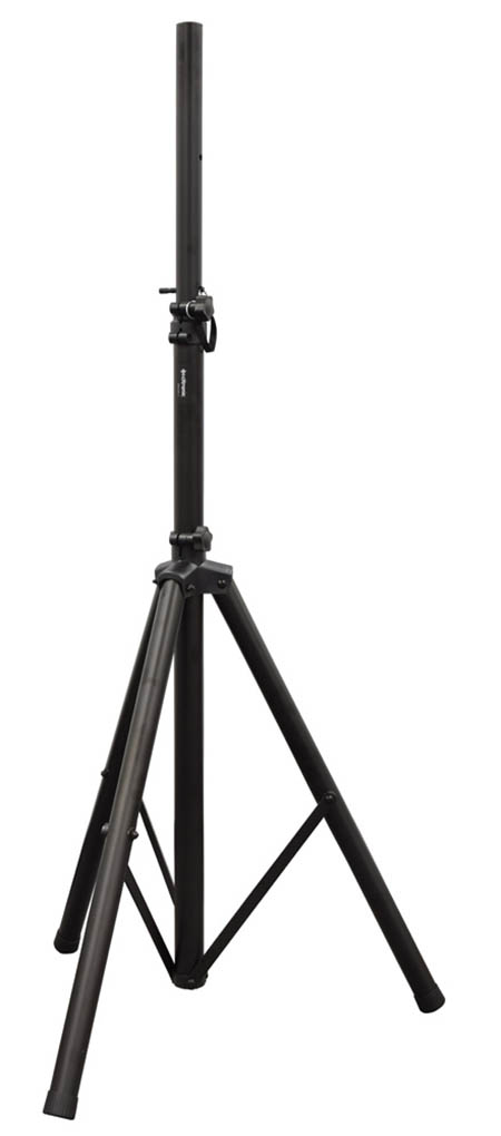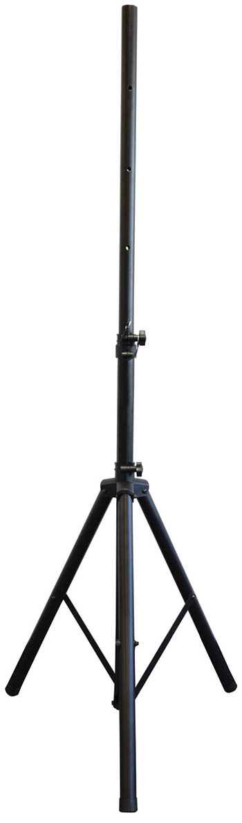 Short Adjustable Speaker Stand. 35mm Centre Pole. Steel Locking Pin. Constructed from Aluminium. LightweightLength when closed: :- 530mm Height: :- 700-970mm Maximum load: :- 50kg Tube Diameter: :- 35mm Maximum Footprint: :- 600mm Weight: :- 2kg. A very compact and small stand for speakers with heavy load capacity. This small stand for speakers includes a safety pin- so if the tightening knob is not secured correctly- the speakers will not drop. Adjustable between 700-970mm- this small stand for speakers is lightweight for travel and can take a maximum load of 50kg. . Small stand for speakers with 35mm top pole - max height 97cm. A compact loudspeaker stand with heavy load capacity- including safety pin to prevent any speaker drops . speaker stand