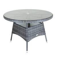 Soak in the summer sunlight with the Charles Bentley range of garden furniture, each constructed with a different practical purpose in mind. Whether that's for dining, sunbathing, or relaxing under the shade, you can rest easy knowing that your new furniture set has been crafted with six generations of manufacturing excellence.Create the perfect outdoor dining setting with this large sized round rattan dining table. Ideal for seating up to 4 people, this modern dining table is constructed from a flat weave, variegated rattan. Completed with a strong steel frame and a tempered glass table top for added strength, there's a hole for a parasol. Ideal for keeping your family cool in the shade, as you dine alfresco. This large sized rattan dining table comes in a choice of either natural or grey. This high quality rattan dining table can be teamed perfectly with our other rattan garden furniture.Please Note:Matching outdoor furniture and accessories are available.Features:Seats up to 4 peopleParasol holeEasy to maintain & cleanWeatherproofClear glass tempered table topContemporary styleVariegated durable rattanIncludes:1x dining tableMaterials:Steel framePE rattan5mm tempered glassDimensions:Table height: 74cmTable width: 110cmParasol diameter: 4cmRattan thickness: 1.2mmWeights:20.2kgColours:GreyAdditional Info:Guarantee: 1 yearCare instructions: To extend the product life and appearanceWe advise to store the furniture in a cool and dry indoor place during the winter and unexpected weather conditionsCheck that the furniture is completely clean and dry before storing indoorsWipe with warmSoapy water and dry thoroughly.Some self-assembly required. Full instructions provided.