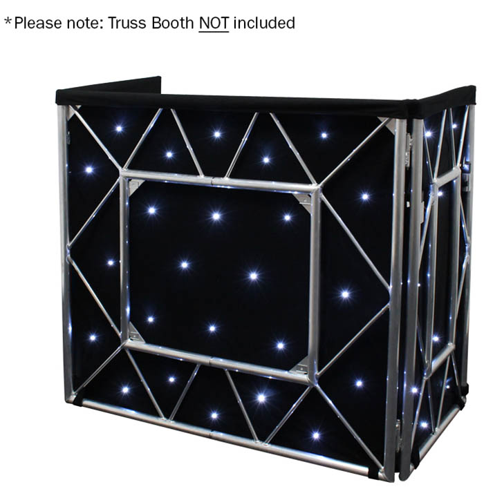 Complete DJ Booth System. Lighting Crossbar and 2 Detachable Podiums Included. Adjustable Height and Width. Two Carpet Covered Boards Provide a Large Working Area. Two Zipped Carry Bags Included. Side Panels are Adjustable from 90 to 145 Degrees. Two Colour Options AvailableAdjustable Height: 1800 - 2400mm Adjustable Width: 1440 - 2000mm Main Shelf Height: 1015mm Max Load Crossbar: 30Kg Max Load Shelves: 30Kg (Per Shelf Evenly Distributed) Weight: 28Kg. SDX V2 foldable DJ booth has been designed and engineered by working performers to be the most practical and versatile entertainment booth in the market. Manufactured in a tough and durable- powder coated steel finish with solid welded construction points- the SDX V2 booth is built to last. This professional folding presentation display system enables you to set up the booth much faster than other systems that are available. The package also includes a pair of podium shelves. Due to the innovative design features- the booth is fully adjustable in height from 1.8m to 2.4m and in width from 1.44m to nearly 2m. The package is supplied with everything required for the initial setup and includes 2 bags for easy transportation of the booth. Two rugged- carpet finished boards are supplied to fit upon the width adjustable cross bars- giving a working area of 122cm wide x 48cm deep. There are no less than 11 fixture mounting points on the top of the lighting bar and the mounting bolts come supplied with the unit. The top bar can be split into 2 x T bars or one continuous bar. The white scrim panels allow for rear projection of a lighting effect to give you a professional presentation for your clients at your venue. The 4 x white elasticated material panels are attached by the stitched hook and loop strips and are made from machine washable and flame retardant material.. dj booth-folding dj booth