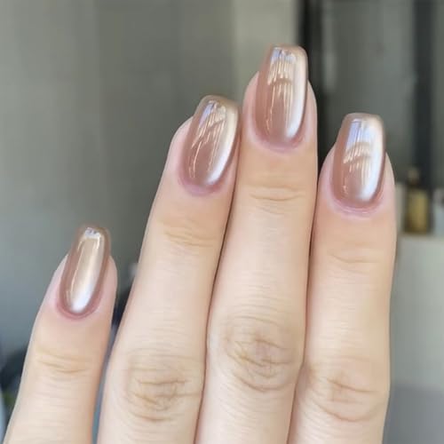 Amoji Nude Cat Eye Press On Nails,Glossy Emerald Shimmer Fake Nails,24Pcs Reusable Acrylic Stick On Nails for Women