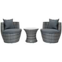 Soak in the summer sunlight with the Charles Bentley range of garden furniture, each constructed with a different practical purpose in mind. Whether that's for dining, sunbathing, or relaxing under the shade, you can rest easy knowing that your new furniture set has been crafted with six generations of manufacturing excellence.Create the perfect retreat for friends and family with this 3 piece rattan stacking furniture set. Comprising of two sleek and stylish rattan chairs, the set is completed with a table with a toughened glass top. Offering a clever space saving design, the 3 pieces can be stacked together, for easy storage. Crafted from robust variegated rattan and Aluminium, this stylish set is weatherproof for added durability. Available in either a natural or grey shade, this contemporary 3 piece rattan stacking furniture set will look attractive on any patio or garden.Please Note:Matching outdoor furniture and accessories are available.Features:Seats up to 2 peopleWeatherproofSpace saving stacking functionModern sculpture shapeFireproof fabricClear glass tempered tabletopIncludes:2x chairs1x coffee table2x seat cushions2x scatter cushionsMaterials:PE rattanSteel frameTempered glassPolyesterDimensions:Table height: 46cmTable width: 52cmChair height: 73cmChair width: 72cmCushion thickness: 5cmRattan thickness: 1.2mmWeights:Chairs: 9kg eachTable: 5.2kgColours:GreyAdditional Info:Max. user weight: 100kgSome self-assembly required. Full instructions provided.