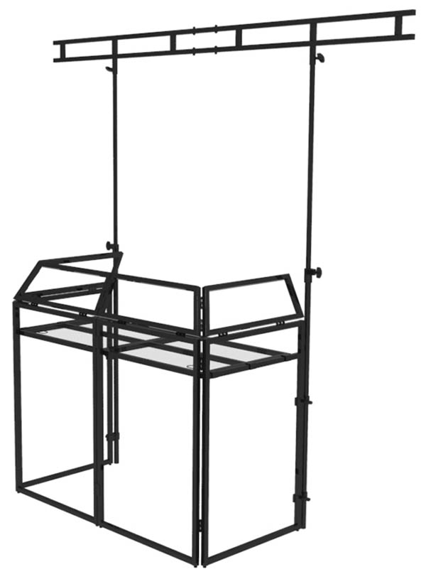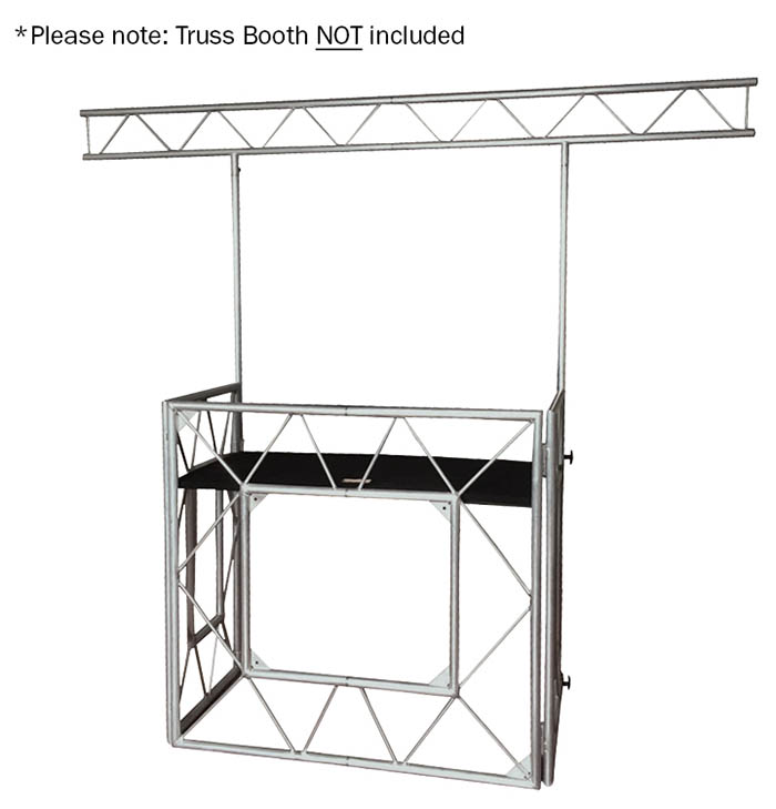 Professional DJ Booth . Compact and Collapsible to Half of its Width. Lightweight Design. Functional and Professional Looking. Tube Diameter 32mm. Front Board to Add Custom GraphicMaximum Load: 30Kg Tube Diameter: 32mm Dimensions: 1207 x 610 x 1155mm Weight: 18Kg. The American DJ Pro Event Table is designed as a professional alternative to folding banquet tables- the booth/table is a compact and collapsible unit with a modern clean look ideally suited to a range of applications. Not only is the Pro Table II lightweight and portable- but it is also cleverly-designed so the event surface is easily brandable. This makes it well suited to exhibition and commercial use. The Pro II table offers a professional way to support and use your control equipment.. dj booth-adj event table- ADJ Pro Event Table