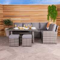 Each piece of our garden furniture range aims to be a combination of practicality and comfort. Whether that's for dining, sunbathing, or relaxing under the shade, you can rest easy knowing that your new furniture set has been crafted with our customers in mind.Perfect for entertaining guests outdoors on warm summer evenings, this deluxe multi-functional 6 seater rattan dining set will add a modern feel to any garden or patio. Comprising of an L-shaped sofa, table, footstools and both seat and back cushions, this versatile dining set can be quickly transformed from a dining set into a lounge set. Ideal for both indoor and outdoor use, this stylish dining set is constructed with a strong steel frame and is finished in an attractive flat weave, variegated rattan. Easy to maintain, the set is weatherproof and can withstand the elements.Please Note:Matching outdoor furniture and accessories are available. Care Instructions: To extend the product life and appearance we advise storing the furniture in a cool and dry indoor place during the winter and unexpected weather conditions. Check that the furniture is completely clean and dry before storing indoors. Bring cushions inside when not in use. Wipe with warm soapy water and dry thoroughly.Features:Seats up to 6 peopleWeatherproofRemovable cushionsMultifunctional casual dining setClear glass tempered table topSeat & back cushions2 footstoolsMaterials:Steel frame5mm tempered glassPE rattan200g UKFR spun polyesterDimensions:3 seater height: 87cm3 seater length: 186cm3 seater width: 72cm2 seater height: 87cm2 seater length: 80cm2 seater width: 72cmFootstool height: 34cmFootstool length: 40cmFootstool width: 40cmTable height: 67cmTable length: 144cmTable width: 84cmCushion thickness: 8cmRattan thickness: 1.2mmWeights:3 seater sofa: 20.6kg2 seater sofa: 20.4kgFootstool: 3kgTable: 24kgColours:GreyAdditional Info:Chair maximum user weight: 100kgSome self-assembly required. Full instructions provided.This product will be delivered on a pallet, which cannot be disposed of by the courier team. The recipient will be responsible for the disposal of the pallet.