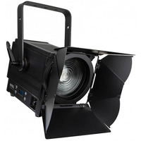 Warm White LED Fresnel. Comparable to 1kW Halogen Spotlight. Manual Beam Adjustment. Temperature Controlled- Low Noise Fan. Manual or DMX Control. Flicker Free for TV Recordings. Manual Dimming & Zoom/Focus Control. 3/5 Pin DMX & PowerCon Daisy Chaining. Barndoor IncludedPower Supply: 100-240Vac- 50/60Hz Power Consumption: 105W LED: 100W Beam Angle: 15-45 Degrees DMX Channels: 1- 2- 3 or 4 Dimensions: 350 x 223 x 392mm Weight: 7.2Kg. A professional 100W COB LED Fresnel theatre spot with similar light output to a 1000w conventional lamp- but using only 15% of the power! A manual zoom control on the rear of the light can be adjusted to change the beam angle between 15 & 45 degrees. A Fresnel lens creates a soft spot and multiple units can be crossed to make a general wash for stage- studio and exhibition work. The supplied barndoors reduce unwanted light spill. The light accepts DMX control; with 1-2-3 and 4 channel DMX. Dimming curves can be adjusted on the rear menu or via DMX. Temperature controlled fans provide an almost silent operation- this in conjunction with the 1.2KHz refresh makes this light suitable for TV studios. Connections are versatile- 3 pin or 5 pin DMX- powercon daisy chaining and the option to use a wireless USB receiver dongle(sold separately) if desired. All in all this is a feature packed LED theatre spot- suitable for a wide range of stage lighting applications.. stage fresnel-led fresnel-stage light-led stage light