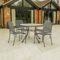 The Alexander Rose Portofino 4 Seater Metal Garden Furniture Set with Round Table & Armchairs comfortably seats four people around its wire mesh table, resulting in a compact garden or patio set that requires little or no maintenance making it a delight to own. Wire mesh that is precisely bonded to the frame and tubular steel that has been finely powder coated make up the modern Alexander Rose Portofino collection. Please Note: Cushions are an optional extra, please select from drop down menu. Set consists of: 4x Portofino Armchairs 1x Portofino Round 1.05m Table Specifications Chair Dimensions: 55cm (W) x 88cm (H) x 66cm (D) Chair Weight (kg): 6.5 Table Dimensions: 105cm (W) x 74cm (H) x 105cm (D) Table Weight (kg): 10.5 Parasol Hole Diameter: 40cm . Alexander Rose Portofino 4 Seater Metal Garden Furniture Set with Round Table & Armchairs, Set only
