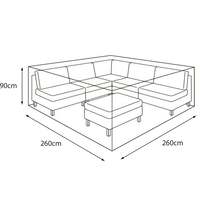 Give your Modular Garden Furniture Set a longer life by protecting it with an LG Outdoor Large Modular Set Deluxe Cover. Made of 600 Denier Polyester , this great cover reduces cleaning and maintenance, plus protect your furniture from UV rays and general dirt & grime. Its breathable material prevents the build up of mould under the cover. For best results, use a water shedding pole when applicable to shed rain water off the cover and stop it accumulating on the surface. This can be improvised by using a broom handle or similar, placed in the parasol hole of the table. This creates a peak that the water will run off and prevent seepage. Complete with straps and buckles to attach covers under the furniture so the cover stays out in wind and shockcords and stainless steel eyelets mean the cover can be pulled in tight around the furniture for a snug, tidy-looking fit Dimensions Width: 260cm Length: 260cm Height: 90cm