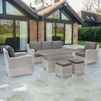 The Kettler Palma Signature White Wash Casual Dining Sofa Set with High/Low Slat Top Table includes a 3-seater outdoor sofa, height adjustable high/low aluminium wood-effect slat top table, 2 armchairs, and comfy stools. The soft cushions of the outdoor corner sofa have a foam core. The amazing adjustable high low slat top table is simple to operate. Keep it low for a coffee table appearance, or raise it for a more formal outdoor dining experience. The Kettler Palma outdoor furniture line is made of handwoven weatherproof wicker that is wrapped around a strong aluminium frame. They are available in a choice of two colours: White Wash and Oyster. This outdoor furniture will look fantastic on your patio, deck, or veranda. It's also a great choice for modern conservatory furniture! Set Features Set includes a 3 seater sofa, high low slat top table, 2 armchairs, and two stools Material: Aluminium square tube frame with 6mm half round wicker Weatherproof, UV resistant wicker – leave outdoors all year round (except cushions) Durable and long-lasting – built to the highest specification with extra supports along sofa Cushions included 8cm foam core seat cushions Double piped back cushions for additional support Stain resistant cushions with shower resistance – we advise taking cushions indoors when not in use Seats 7 people (approx.) 3-year warranty Colour: White Wash Set Dimensions Sofa: 85cm (H) x 190cm (W) x 80cm (D) Sofa's Seat Height: 48cm Sofa's Arm Height: 64cm Stool(s): 48cm (H) x 38cm (W) x 38cm (D) Stools' Seat Height: 48cm Armchair(s): 85cm (H) x 74cm (W) x 80cm (D) Armchairs' Seat Height: 48cm Armchairs' Arm Height: 64cm Table: 49/69cm (H) x 145cm (W) x 81cm (D)