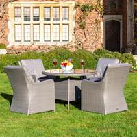 The Bracken Outdoors Georgia 4 Seat Round Rattan Garden Furniture Set is perfect for any sized garden or patio area. It is manufactured from a Slate Grey flat weave hand woven around an aluminium frame and the outdoor dining table is finished with a 5mm tempered glass top . The Georgia chairs come complete with Truffle coloured cushions that are deep and padded for extra comfort and with removable covers for easy cleaning. This set can be left outside all year round but it is advisable to bring the cushions in when not in use. Cleaning the weave is easy. Simply wash it down with warm, soapy water or alternatively you can keep it covered with a quality breathable cover. Set Features Georgia 1.1m Round rattan table with glass top Georgia rattan armchairs with truffle cushions Aluminium frame 5mm tempered glass top Removable and washable cushion covers Warranty - 5 Years Set Dimensions Table: 110cm (L) x 74cm (H) Chair(s): 89cm (H) x 65cm (W) x 60cm (L) Cushion Depth: 5cm