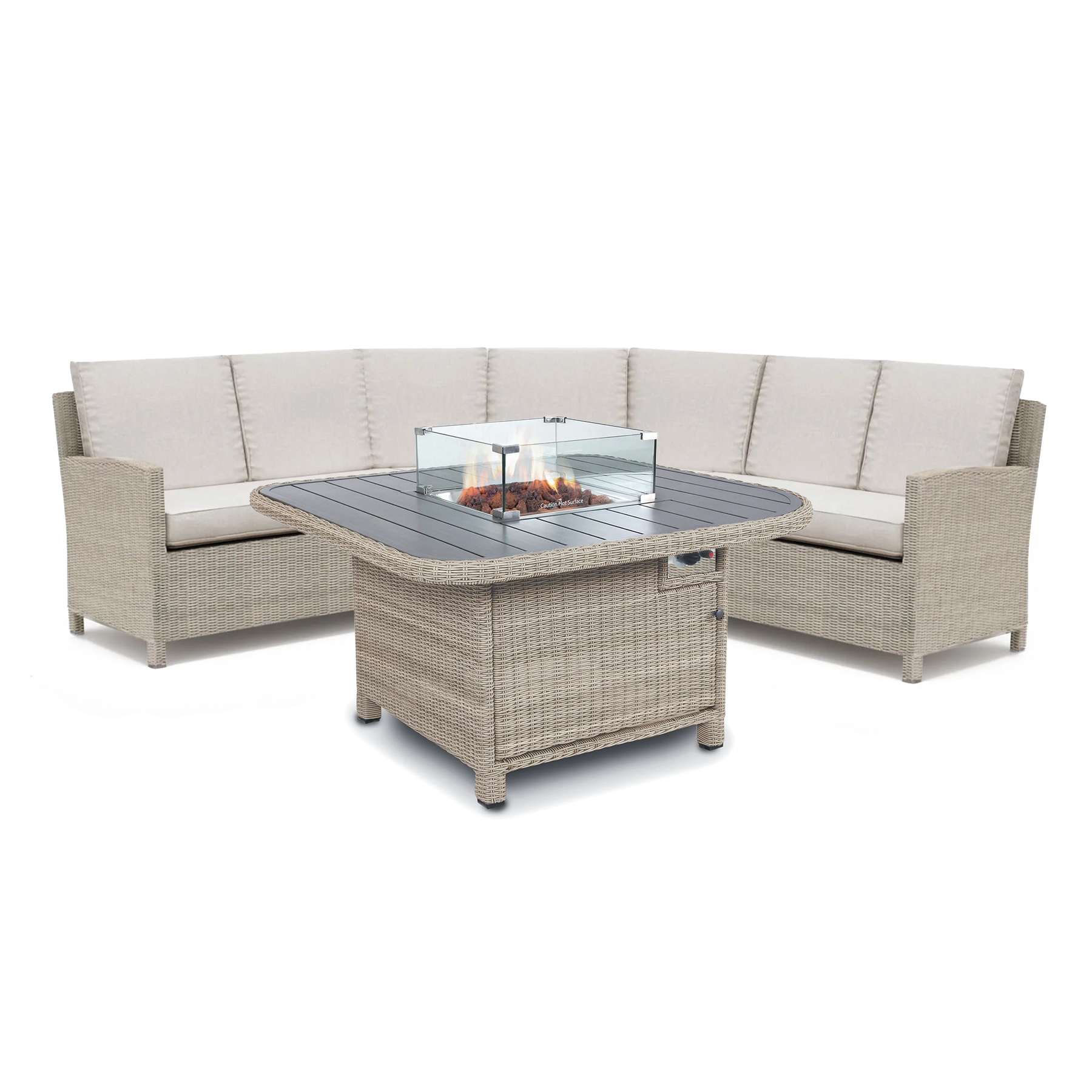 The Bracken Outdoors Venice 10 Seat Curved Rattan Outdoor Dining Set is just the thing for entertaining, allowing you to dine and relax in style. The 1.35m glass-topped outdoor table comes with a handy Lazy Susan , especially useful if you are catering for 10! The 6 seater curved sofa provides a relaxed dining experience and the 4 outdoor dining chairs enable a more formal position. The Bracken Outdoors Venice collection features contemporary styling in a durable, hand-woven poly rattan 5mm round weave . The fantastic two-tone 'shabby chic' design is complemented by the Cream cushions and the covers are removable and washable. Complete with a 3-year warranty . This set consists of: 2 curved sofas 4 garden dining chairs 1 glass topped outdoor table with Lazy Susan Cream cushions (base 10cm deep and back 12cm thick)