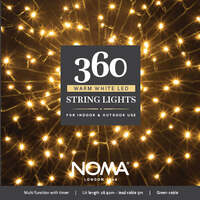 Brighten up your Christmas with these Multifunction Warm White LED string lights! Available in assorted LED quantities and suitable for indoor and outdoor use. The 8 function controller allows you to personalise your lights with 8 different effects. From a slow twinkle to a fast flash, the choice is yours! The memory function also allows you to choose and set your favourite function. The easy timer allows you to set your lights to come on for the same 8 hours each day, simply press the button when you want them to come on and they will stay on for 8 hours. They will come on at the same time every day until you reset them! If you would prefer the timer can be turned off completely. Warm White LED Light Chain 5m Lead Length Green Cable 8 Functions -Combination,Sequential,Chasing Flash,Twinkle Flash,In Waves, Slo Glo, Slow Fade,Static. Easy timer Light chain length 120 Bulbs-8.92m 240 Bulbs-17.92m 360 Bulbs-26.92m 480 Bulbs-35.92m 720 Bulbs-53.92m 1000 Bulbs - 74.92 . Noma Christmas 120, 240, 360, 480, 720, 1000 Multifunction String Lights with Green Cable - Warm White, 360 Bulbs
