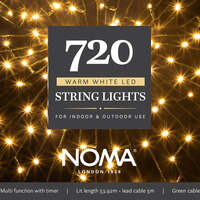 Brighten up your Christmas with these Multifunction Warm White LED string lights! Available in assorted LED quantities and suitable for indoor and outdoor use. The 8 function controller allows you to personalise your lights with 8 different effects. From a slow twinkle to a fast flash, the choice is yours! The memory function also allows you to choose and set your favourite function. The easy timer allows you to set your lights to come on for the same 8 hours each day, simply press the button when you want them to come on and they will stay on for 8 hours. They will come on at the same time every day until you reset them! If you would prefer the timer can be turned off completely. Warm White LED Light Chain 5m Lead Length Green Cable 8 Functions -Combination,Sequential,Chasing Flash,Twinkle Flash,In Waves, Slo Glo, Slow Fade,Static. Easy timer Light chain length 120 Bulbs-8.92m 240 Bulbs-17.92m 360 Bulbs-26.92m 480 Bulbs-35.92m 720 Bulbs-53.92m 1000 Bulbs - 74.92 . Noma Christmas 120, 240, 360, 480, 720, 1000 Multifunction String Lights with Green Cable - Warm White, 720 Bulbs