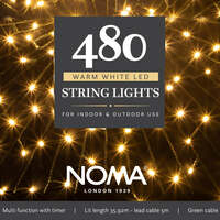 Brighten up your Christmas with these Multifunction Warm White LED string lights! Available in assorted LED quantities and suitable for indoor and outdoor use. The 8 function controller allows you to personalise your lights with 8 different effects. From a slow twinkle to a fast flash, the choice is yours! The memory function also allows you to choose and set your favourite function. The easy timer allows you to set your lights to come on for the same 8 hours each day, simply press the button when you want them to come on and they will stay on for 8 hours. They will come on at the same time every day until you reset them! If you would prefer the timer can be turned off completely. Warm White LED Light Chain 5m Lead Length Green Cable 8 Functions -Combination,Sequential,Chasing Flash,Twinkle Flash,In Waves, Slo Glo, Slow Fade,Static. Easy timer Light chain length 120 Bulbs-8.92m 240 Bulbs-17.92m 360 Bulbs-26.92m 480 Bulbs-35.92m 720 Bulbs-53.92m 1000 Bulbs - 74.92 . Noma Christmas 120, 240, 360, 480, 720, 1000 Multifunction String Lights with Green Cable - Warm White, 480 Bulbs