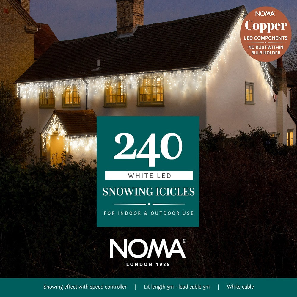 These LED Icicle Lights by Noma come in assorted sizes and are suitable for indoor or outdoor use. With Natural Snowing effects and Memory Easytimer included. The Easytimer allows you to set your lights to come on for the same 8 hours each day. Simply press the button when you want them to come on and they will stay on for 8 hours. They will come on at the same time every day until you reset them! If you would prefer, the timer can be turned off completely. Since copper is now used to make the LED components, the traditional problem of rust inside the bulb holder is resolved. Features White/Ice Blue LED's Snowing function Energy saving long life bulbs Easytimer 5m Lead Cable Long life LEDs with over 20,000 hours Lit Length (First Bulb to last Bulb): 2.9m (144 bulbs), 5m (240 bulbs), 7.6m (360 bulbs), 10.2m (480 bulbs), 15.4m (720 bulbs), 20.6m (960 bulbs) Suitable for indoor or outdoor use Gutter Hooks Included . Noma Christmas 240, 360, 480, 720, 960 Snowing Icicle LED Lights with White Cable- White/ Ice Blue, 960 Bulbs