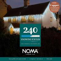 These LED Icicle Lights by Noma come in assorted sizes and are suitable for indoor or outdoor use. With Natural Snowing effects and Memory Easytimer included. The Easytimer allows you to set your lights to come on for the same 8 hours each day. Simply press the button when you want them to come on and they will stay on for 8 hours. They will come on at the same time every day until you reset them! If you would prefer, the timer can be turned off completely. Since copper is now used to make the LED components, the traditional problem of rust inside the bulb holder is resolved. Features White/Ice Blue LED's Snowing function Energy saving long life bulbs Easytimer 5m Lead Cable Long life LEDs with over 20,000 hours Lit Length (First Bulb to last Bulb): 2.9m (144 bulbs), 5m (240 bulbs), 7.6m (360 bulbs), 10.2m (480 bulbs), 15.4m (720 bulbs), 20.6m (960 bulbs) Suitable for indoor or outdoor use Gutter Hooks Included . Noma Christmas 240, 360, 480, 720, 960 Snowing Icicle LED Lights with White Cable- White/ Ice Blue, 240 Bulbs