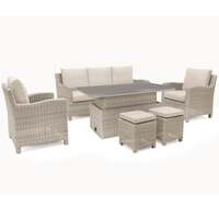The Kettler Palma Signature Oyster Wicker Outdoor Casual Dining Lounge Sofa Set with Height Adjustable High/Low Aluminium Wood Effect Slat Top Table is a stunning outdoor sofa set that can be placed in a variety of outdoor locations. It includes a 3-seater outdoor sofa, an adjustable height high low table with aluminium slat top, 2x armchairs, and comfy stools. The cosy cushions of the sofa have a form core. The wonderful adjustable height table is quick and easy to use. For a coffee table appearance, keep it low; for a more formal outdoor dining setting, raise the height. The handwoven weatherproof wicker used in the Kettler Palma outdoor furniture collection is wrapped in a robust aluminium frame. White Wash or Oyster are the two colours that are offered. Your patio, deck, or veranda will look amazing with this outdoor furniture. It's also a fantastic option for modern conservatory furniture! Set Features Set includes a 3-seater sofa, high low slat top table, 2 armchairs, and two stools Material: Aluminium square tube frame with 6mm half round wicker Weatherproof, UV resistant wicker – leave outdoors all year round (except cushions) Durable and long-lasting – built to the highest specification with extra supports along sofa Cushions included - 12cm deep 8cm foam core seat cushions Double piped back cushions for additional support Stain and shower resistance cushions – we advise taking cushions indoors when not in use Seats 7 people (approx.) 3-year warranty Colour: Oyster Set Dimensions Sofa: 85cm (H) x 190cm (W) x 80cm (D) Sofa's Seat Height: 48cm Sofa's Arm Height: 64cm Stool(s): 48cm (H) x 38cm (W) x 38cm (D) Stools' Seat Height: 48cm Armchair(s): 85cm (H) x 74cm (W) x 80cm (D) Armchairs' Seat Height: 48cm Armchairs' Arm Height: 64cm Table: 49/69cm (H) x 145cm (W) x 81cm (D)