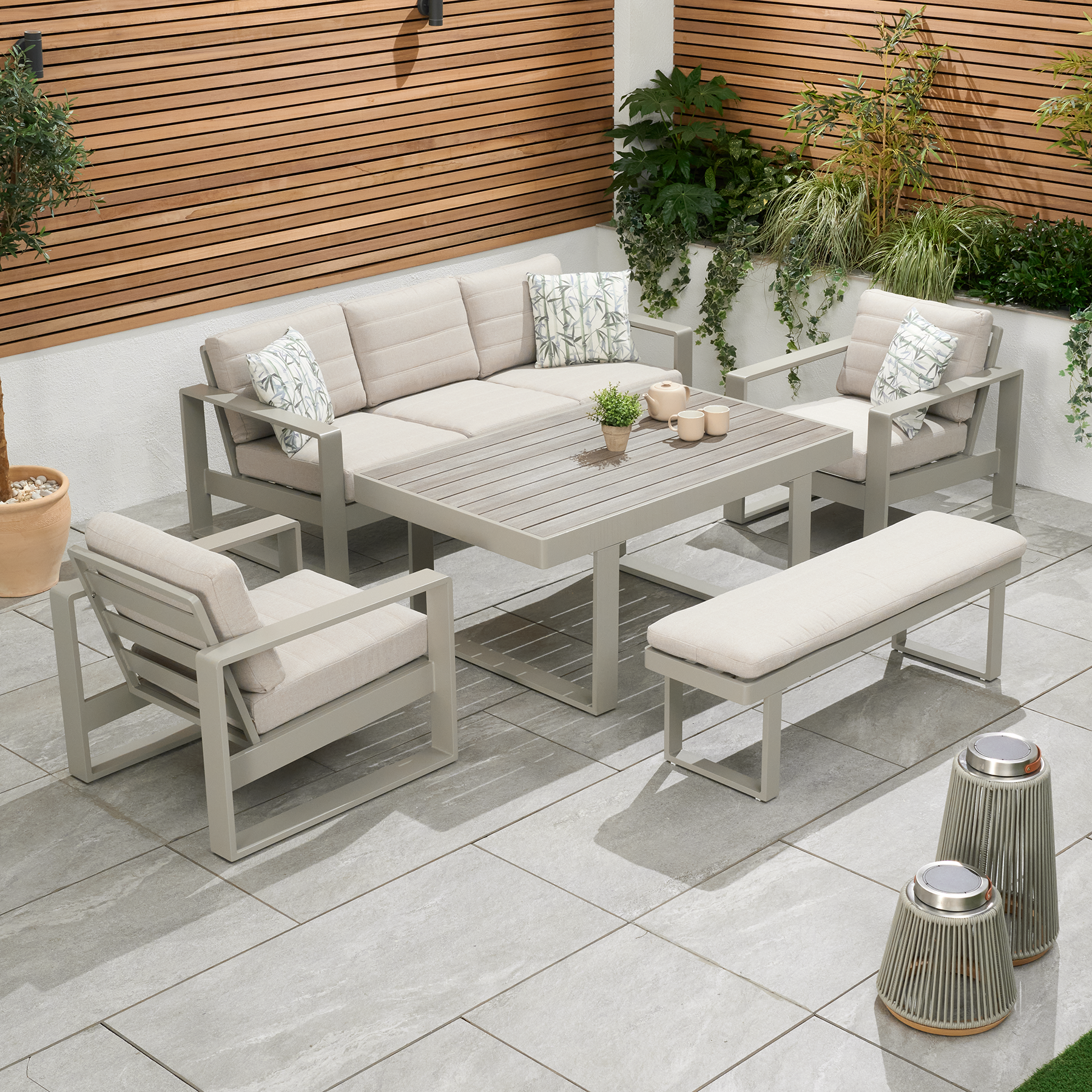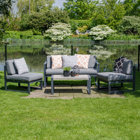 The LG Outdoor Turin aluminium collection is a great way to relax and enjoy some well-earned peace and quiet. Sleek graphite grey aluminium frames surround wood-like aluminium table tops for a contemporary feel but without the usual maintenance. This modern set is complete with graphite grey sofa frames with texteline seating which is not only comfortable but weatherproof too. Perfect for sitting back and relaxing in any garden. This set consists of a pack away sofa, 2x lounge chairs, a coffee table and cushions. Features Seasonproof Eden Cushions- water repellent, UV resistant, superior ‘comfort filling’ and natural feel fabric. Aluminium frame and Texteline seats Powder coated aluminium frames are anti-rust and can be left outdoors all year round Wood-effect aluminium table top Removable cushion covers for easy cleaning 3 year limited warranty
