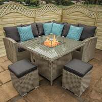 The Bracken Outdoors Michigan Mini Corner Casual Dining Set with Fire Pit Table is perfect if you enjoy entertaining and relaxing. You can use this corner sofa rattan garden furniture set with fire pit table in the garden, on the patio, on the decking and if you're lucky enough to have a large balcony or veranda...then, it can even work there too. The outdoor furniture is manufactured from a Cappuccino flatweave handwoven around an aluminium frame and the table is finished off with a 5mm tempered glass top and a fire pit insert . The fire pit has a glass surround to shroud the flame and is perfectly sized to allow a dining room alongside. The cushions come in Ash Grey , made using 100% Polyester fabric , and are resistant to shrinking and staining . Covers are removable for easy washing. This set can be left outside all year round, but it is advisable to bring the cushions in when not in use. Cleaning the weave is simple. You can wash it down with warm, soapy water or alternatively you can keep it covered with a quality breathable cover. Set Features Michigan sofas with 10cm deep Ash Grey cushions Michigan 1m square rattan table with glass top and firepit insert 2x Michigan rattan stools with 7cm deep cushions Aluminium frame 5mm tempered glass top Removable and washable cushion covers Warranty - 5 Years Set Dimensions Table: 100cm (L) x 100cm (D) x 74cm (H) Sofa's Overall Length: 190 x 190cm Base Cushion on Sofa Depth: 10cm Stool Cushion Depth: 7.5cm Recommended Footprint: 260cm x 260cm