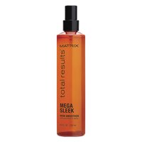 Matrix Total Results Mega Sleek Iron Smoother - 250ml \nHeat Protection Spray \nExposing your hair to heat styling everyday can rip your hair of natural oils and moisture. This can lead to hair damage. But do not worry! Applying the right heat protectant can prevent hair damage. The Matrix Total Results Mega Sleek Iron Smoother safeguards the hair against effects of heat styling for smoothness and all-day frizz control. Once you apply the smoother over your hair locks, ironing them becomes easier. The Iron Smoother maximizes the performance of thermal tools.\nFinest Heat Protectant on the Market \nThe Sleek Iron Smoother acts like a heat protectant spray, perfect for frizz prone mane. The hair spray transforms the tresses from dull and unruly to glossy and luscious. The Matrix Total Results Smoother is infused with shea butter to tame frizz and flyaways flawlessly. Frizzy, dry and coarse hair becomes more manageable with shea butter extracts. The Matrix Iron Smoothing Spray is a must have prior to using hot styling tools. The heat styling spray offers humidity protection to the hair. Get glossier finish for a longer time with flat irons.\nHair Care Formula Rich in Castor Oil and Silk Amino Acids\nThe heat protection spray is rich in castor oil. Like other natural oils, castor helps trap moisture in the hair and smoothen the cuticle. The Matrix Mega Sleek Smoother has the perfect ingredient to tame lackluster, coarse, coiled and frizzy hair. Castor Oil also has anti-inflammatory and anti-bacterial properties. Another beneficial ingredient in the hair spray is silk amino acids, which helps prevent moisture loss. The silk molecules keep the hair hydrated and free from tangles.