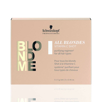Schwarzkopf Professional BlondMe All Blondes Detoxifying System Vitamin C Shot (5 x 5g) is a clarifying and detoxifying hair remedy formulated to be used on blonde hair kinds and developed to be used in combination with the BlondMe All Blondes Detox Mask.\nIt helps to clarify golden tresses, removing difficult water minerals and different unwanted residues. This treatment correctly counteracts green tones as a result of chemical aggressors, removing the ions responsible for inflicting the greenish swimming pool impact in blondes and lighter shades.\nAdded Vitamin C bolsters this remedy by rebuilding internal hair bonds, reducing hair fall from breakage. Hair is left stronger and visibly brighter, with a revitalised golden glow.