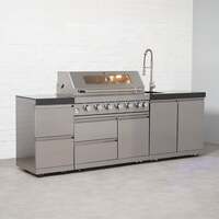 The stunning Draco Grills 6 Burner BBQ Modular Outdoor Kitchen with Double Drawers and Sink Unit will look fantastic in your garden. The grill of the Z640 6 Burner Gas BBQ is made up of a double skinned stainless steel hood, stainless steel tubular burners and a solid galvanised frame. It is a stainless steel gas barbecue that's perfect for those seeking simple sophistication in the garden - a grill which is great to look at and even better to cook on! It can be converted to Natural Gas with a Draco Grills Outdoor Kitchen Natural Gas Conversion Kit (DRA9941). Combined with the Draco Grills Double Drawers providing extra storage space and the Draco Grills Single Fridge Unit to keep your drinks nice & cool, giving you the perfect Outdoor Kitchen. Please Note: The granite side panels are an added extra for this kit and can be selected via the drop-down menu, without these the kit will have stainless steel sides! A BBQ griddle is also not included with this package, but is available as an optional extra. 6 Burner BBQ Features & Specifications Stainless steel hood (double skinned) 430 commercial grade stainless steel Six stainless steel tubular burners Stainless steel fascia panel Infra-red back burner LED Lights Fold-down side shelves Stainless steel cooking grills Double drawer roller system 1 cupboard and 2 drawers underneath the BBQ Hidden locking caster wheels Can be converted to Natural Gas with a conversion kit Cooking Area: 43cm x 97cm Total Heat Output: 90,000 BTU (12,500 BTU per main burner, 15,000 BTU for rear burner, so total is 12,500 x 6 + 15,000 = 90,000 BTU) 5 year limited warranty Dimensions: 119cm (H) x 110cm (W - exc. shelves) & 191cm (W - inc. shelves) x 57.5cm (D - exc. hood and controls which protrude) & 68cm (D - when hood is open) Sink Unit Features & Specifications Designed for outdoor installation 430 commercial grade stainless steel Stainless steel tap Warranty: 2 years (cabinet) and 1 year (sink, tap, and granite top) Dimensions: 90cm (H) x 83cm (W) x 57.5cm (D) Double Drawer Unit Features & Specifications 430 commercial grade stainless steel Granite work surface Warranty: 2 years (cabinet) and 1 year (granite top) Dimensions: 90cm (H) x 48.5cm (W) x 57.5cm (D) Overall Kitchen Dimensions Height: 119cm Width: 242cm Depth: 57.5cm (exc. hood and controls which protrude) If this Outdoor BBQ Kitchen does not fit your needs, don't forget to check out our other straight run and L shape options. . Draco Grills 6 Burner BBQ Modular Outdoor Kitchen with Double Drawers and Sink Unit, Late May 2025 / With Granite Side Panels