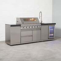 Entertain family & friends in style with a Draco Grills 6 Burner BBQ Modular Outdoor Kitchen with Gas Bottle Cabinet, Single Fridge & Sink . It is great for anyone who wants to add a touch of elegance to your garden - it is lovely to look at and much more enjoyable to cook on! The magnificent Draco Grills Z640 6 Burner Gas BBQ would look great in your garden. The grill is constructed with a double skinned stainless steel hood, stainless steel tubular burners and a galvanised frame. It can be converted to Natural Gas using a Draco Grills Outdoor Kitchen Natural Gas Conversion Kit (DRA9941). This kit also includes a Draco Grills Single Fridge & Sink Unit, which provides ample space for dishwashing, food preparation, and storage of drinks. The fridge should be placed away from direct sunlight for the best cooling. The additional cabinet can be used to store your 13kg gas bottle for the BBQ. Please Note: The granite side panels are an added extra for this kit and can be selected via the drop-down menu, without these the kit will have stainless steel sides! A BBQ griddle is also not included with this package, but is available as an optional extra. 6 Burner BBQ Features & Specifications Stainless steel hood (double skinned) 430 commercial grade stainless steel Six stainless steel tubular burners Stainless steel fascia panel Infra-red back burner LED Lights Fold-down side shelves Stainless steel cooking grills Double drawer roller system 1 cupboard and 2 drawers underneath the BBQ Can be converted to Natural Gas using a conversion kit Hidden locking caster wheels Cooking Area: 43cm x 97cm Total Heat Output: 90,000 BTU (12,500 BTU per main burner, 15,000 BTU for rear burner, so total is 12,500 x 6 + 15,000 = 90,000 BTU) 5 year limited warranty Dimensions: 119cm (H) x 110cm (W - exc. shelves) & 191cm (W - inc. shelves) x 57.5cm (D - exc. hood and controls which protrude) & 68cm (D - when hood is open) Sink & Fridge Unit Features & Specifications IPX4 water resistant 430 commercial grade stainless steel 40mm thick insulation 60L capacity fridge Fridge Temperature Range: 2 - 10 °C Designed and tested for scorching heat environments Insulated double-glazed doors with 304-grade stainless steel frames, designed to eliminate condensation Digital adjustable thermostat for temperature control Fridge has blue interior LED lighting Sturdy stainless steel handle 3 adjustable shelves in the fridge Hidden locking castor wheels with built in feet for levelling Granite worktop Fridge is lockable 37Db (when compressor is running) Fridge & Granite Top - 1 year limited warranty Cabinet - 2 year limited warranty Sink - 2 year limited warranty Energy Efficiency Ratin G Dimensions: 152cm (H - including the tap) and 90cm (H - to the top of the unit) x 96cm (W) x 57.5cm (D) Gas Bottle Cabinet Features & Specifications Slimline single cabinet design Built in sliding holder designed for up to 13kg gas bottles 430 grade stainless steel Granite work surface Four large castors with built in feet for levelling Warranty: 2 years (cabinet) and 1 year (granite top) Dimensions: 90cm (H) x 48.5cm (W) x 57.5cm (D) Overall Kitchen Dimensions Height: 119cm Width: 254.5cm Depth: 57.5cm (exc. hood and controls which protrude) If this Outdoor BBQ Kitchen does not fit your needs, don't forget to check out our other straight run and L shape options. . Draco Grills 6 Burner BBQ Modular Outdoor Kitchen with Gas Bottle Cabinet, Single Fridge and Sink, Late May 2025 / With Granite Side Panels