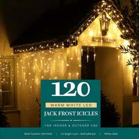 These Warm White LED Icicle Lights come in three sizes and are suitable for indoor or outdoor use. With Natural Snowing effects, twinkling or static and Memory Easytimer included. The easytimer allows you to set your lights to come on for the same 8 hours each day, simply press the button when you want them to come on and they will stay on for 8 hours. They will come on at the same time every day until you reset them! If you would prefer the timer can be turned off completely. Long life LED's with over 20,000 hours Warm White LED's Snowing or static functions Energy saving long life bulbs Easytimer Plug to 1st Bulb - 5m 120 lights - 2.5m 360 lights -7.6m - 74 Icicles 720 lights -15.4m - 144 Icicles Indoor or outdoor Gutter Hooks Included . Noma Christmas Warm White Multifunction Jack Frost Icicles With Clear Cable 120, 360, 720, 120 Bulbs
