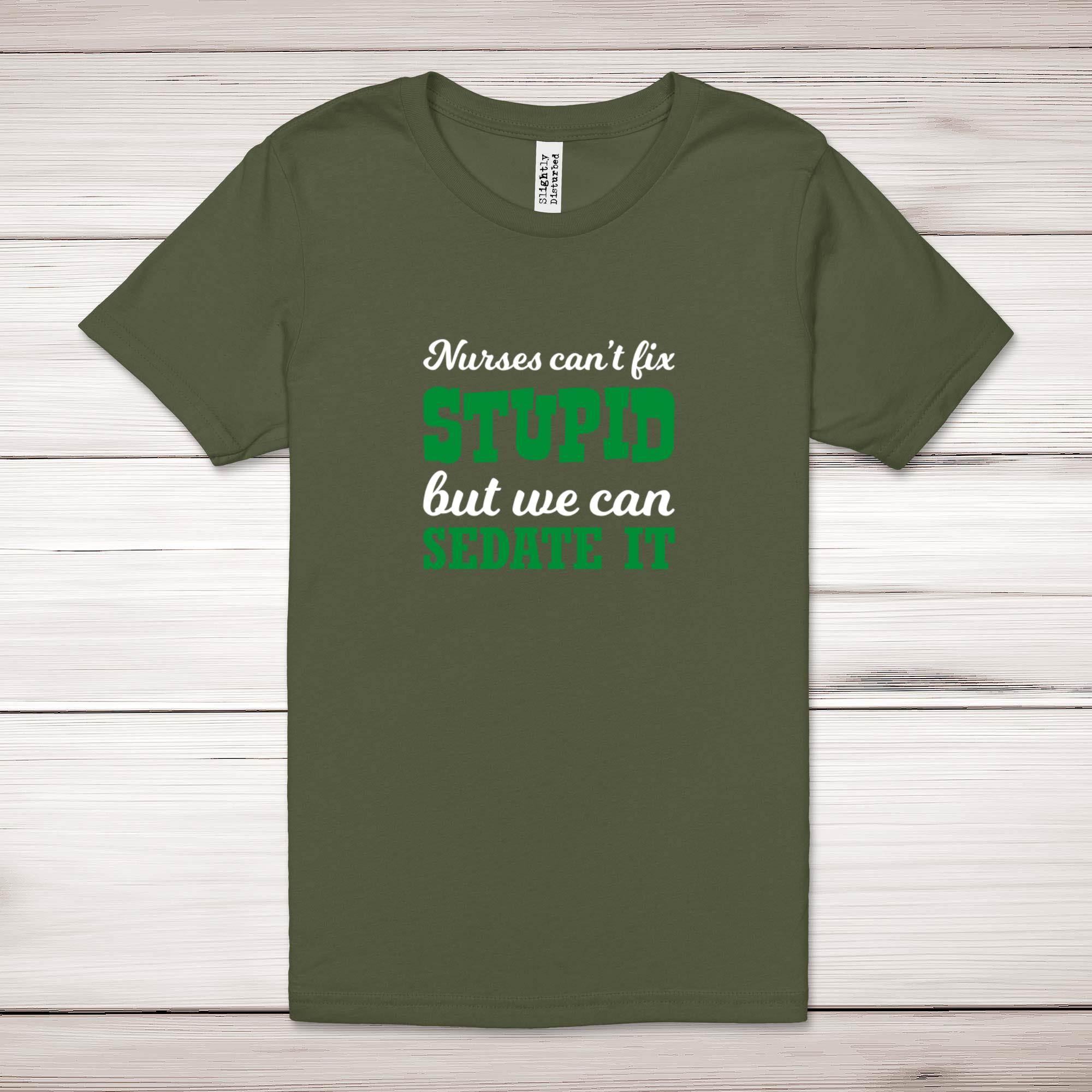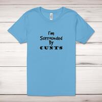 I'm Surrounded By Cunts Adult T-Shirt\nA rude unisex adult t-shirt with "I'm Surrounded By Cunts" printed across the front of a 100% cotton* t-shirt. This rude t-shirt is great as a gift for any occasion.\nAll of our adult t-shirts are designed and hand-printed in the UK and are manufactured from quality 100% pre-shrunk jersey cotton knit for substantial softness and comfort. When quality, durability and substance count, this is the tee everyone can agree on. Featuring a crew neck, short sleeves, twin needle sleeve and bottom hems and unisex sizing. Available in sizes Extra Small to 5XL*. *Black & White tees available in sizes XS - 5XL, all other colours available XS - 2XL \n\nSize Guide\nUnisex adult t-shirts are measured across the chest, in inches\n\n \nXS 30/32"\n\nS 34/36"\n\nM 38/40"\n\nL 42/44"\n\nXL 46/48"\n\n2XL 50/52"\n\n3XL 54/56"\n4XL 58/60"5XL 62/64"\n\n\nSee more on our clothing size guide (opens in new tab)\n\n\nPlease Note\nAll of our adult t-shirts are hand-printed to order, as a result, colours may vary between prints - images are for illustration purposes only.\n