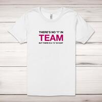 There Is A U In Cunt Adult T-Shirt\nA rude unisex adult t-shirt with "There's No "I" In Team But There Is A U In Cunt" printed across the front of a 100% cotton* t-shirt. This rude t-shirt is great as a gift for any occasion.\nAll of our adult t-shirts are designed and hand-printed in the UK and are manufactured from quality 100% pre-shrunk jersey cotton knit for substantial softness and comfort. When quality, durability and substance count, this is the tee everyone can agree on. Featuring a crew neck, short sleeves, twin needle sleeve and bottom hems and unisex sizing. Available in sizes Extra Small to 5XL*. *Black & White tees available in sizes XS - 5XL, all other colours available XS - 2XL \n\nSize Guide\nUnisex adult t-shirts are measured across the chest, in inches\n\nXS 30/32"\n S 34/36"\nM 38/40"\nL 42/44"\nXL 46/48"\n2XL 50/52"\n3XL 54/56"\n4XL 58/60"5XL 62/64"\n\n\nSee more on our clothing size guide (opens in new tab)\n\n\nPlease Note\nAll of our adult t-shirts are hand-printed to order, as a result, colours may vary between prints - images are for illustration purposes only.\n