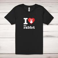 I Love My Rabbit Adult T-Shirt\nA fantastic, rude, 100% cotton* adult t-shirt with "I Love My Rabbit" printed across the front. Simple and straight to the point this rude t-shirt is great as a gift for any occasion.\nAll of our adult t-shirts are designed and hand-printed in the UK and are manufactured from quality 100% pre-shrunk jersey cotton knit for substantial softness and comfort. When quality, durability and substance count, this is the tee everyone can agree on. Featuring a crew neck, short sleeves, twin needle sleeve and bottom hems and unisex sizing. Available in sizes Extra Small to 5XL*..\n\nSize Guide\n\nXS 30/32"\nS 34/36"\nM 38/40"\nL 42/44"\nXL 46/48"\n2XL 50/52"\n3XL 54/56"\n4XL 58/60"5XL 62/64"\n\nSee more on our clothing size guide (opens in new tab)\n\n\nPlease Note\nAll of our adult t-shirts are hand-printed to order, as a result, colours may vary between prints - images are for illustration purposes only.\n