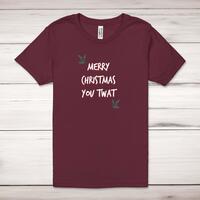 Merry Christmas You Twat Adult T-Shirt\nA rude adult t-shirt with "Merry Christmas You Twat" printed across the front of a 100% cotton* t-shirt. This rude t-shirt is great as a gift for any occasion.\nAll of our adult t-shirts are designed and hand-printed in the UK and are manufactured from quality 100% pre-shrunk jersey cotton knit for substantial softness and comfort. When quality, durability and substance count, this is the tee everyone can agree on. Featuring a crew neck, short sleeves, twin needle sleeve and bottom hems and unisex sizing. Available in sizes Extra Small to 5XL*.\n\n*Black & White tees available in sizes XS - 5XL, all other colours available XS - 2XL\n\nSize Guide\nUnisex adult t-shirts are measured around the chest, in inches\n\nXS 32/34"\nS 34/36"\nM 38/40"\nL 42/44"\nXL 46/48"\n2XL 50/52"\n3XL 54/56"\n4XL 58/60"\n5XL 62/64"\n\nSee more on our clothing size guide (opens in new tab)\n\n\nPlease Note\nAll of our t-shirts are hand-printed to order, as a result, colours may vary between prints - images are for illustration purposes only.\n\n