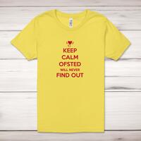 Keep Calm Ofsted Will Never Find Out Adult T-Shirt\nA novelty adult t-shirt with "Keep Calm Ofsted Will Never Find Out" printed across the front of a 100% cotton* t-shirt. This novelty t-shirt is great as a gift for any occasion.\nAll of our adult t-shirts are designed and hand-printed in the UK and are manufactured from quality 100% pre-shrunk jersey cotton knit for substantial softness and comfort. When quality, durability and substance count, this is the tee everyone can agree on. Featuring a crew neck, short sleeves, twin needle sleeve and bottom hems and unisex sizing. Available in sizes Extra Small to 5XL*.\n *Black & White tees available in sizes XS - 5XL, all other colours available XS - 2XL \n\nSize Guide\nUnisex adult t-shirts are measured across the chest, in inches\n\nXS 30/32"\nS 34/36"\nM 38/40"\nL 42/44"\nXL 46/48"\n2XL 50/52"\n3XL 54/56"\n4XL 58/60"5XL 62/64"\n\nSee more on our clothing size guide (opens in new tab)\n\n\nPlease Note\nAll of our t-shirts are hand-printed to order, as a result, colours may vary between prints - images are for illustration purposes only.\n\n