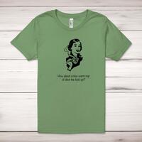 How About A Nice Warm Cup Of Shut The Fuck Up Adult T-Shirt\nA rude adult t-shirt with a choice of two retro graphics and the slogan "How About A Nice Warm Cup Of Shut The Fuck Up" printed across the front of a 100% cotton* t-shirt. This rude t-shirt is great as a gift for any occasion.\nAll of our adult t-shirts are designed and hand-printed in the UK and are manufactured from quality 100% pre-shrunk jersey cotton knit for substantial softness and comfort. When quality, durability and substance count, this is the tee everyone can agree on. Featuring a crew neck, short sleeves, twin needle sleeve and bottom hems and unisex sizing. Available in sizes Extra Small to 5XL*.\n *Black & White tees available in sizes XS - 5XL, all other colours available XS - 2XL \n\nSize Guide\nUnisex adult t-shirts are measured across the chest, in inches\n\nXS 30/32"\nS 34/36"\nM 38/40"\nL 42/44"\nXL 46/48"\n2XL 50/52"\n3XL 54/56"\n4XL 58/60"5XL 62/64"\n\nSee more on our clothing size guide (opens in new tab)\n\n\nPlease Note\nAll of our t-shirts are hand-printed to order, as a result, colours may vary between prints - images are for illustration purposes only.\n\n