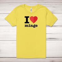 I Love Minge Adult T-Shirt\nA rude adult t-shirt with "I Love Minge" printed across the front of a 100% cotton* t-shirt. This rude t-shirt is great as a gift for any occasion.\nAll of our adult t-shirts are designed and hand-printed in the UK and are manufactured from quality 100% pre-shrunk jersey cotton knit for substantial softness and comfort. When quality, durability and substance count, this is the tee everyone can agree on. Featuring a crew neck, short sleeves, twin needle sleeve and bottom hems and unisex sizing. Available in sizes Extra Small to 5XL*.\n\n*Black & White tees available in sizes XS - 5XL, all other colours available XS - 2XL\n\nSize Guide\nUnisex adult t-shirts are measured around the chest, in inches\n\nXS 32/34"\nS 34/36"\nM 38/40"\nL 42/44"\nXL 46/48"\n2XL 50/52"\n3XL 54/56"\n4XL 58/60"5XL 62/64"\n\nSee more on our clothing size guide (opens in new tab)\n\n\nPlease Note\nAll of our t-shirts are hand-printed to order, as a result, colours may vary between prints - images are for illustration purposes only.\n\n