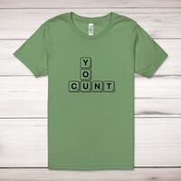 Scrabble Tiles You Cunt Adult T-Shirt\nA rude adult t-shirt with the words "You Cunt" spelled out in the style of Scrabble tiles printed across the front of a 100% cotton* t-shirt. This rude t-shirt is great as a gift for any occasion.\nAll of our adult t-shirts are designed and hand-printed in the UK and are manufactured from quality 100% pre-shrunk jersey cotton knit for substantial softness and comfort. When quality, durability and substance count, this is the tee everyone can agree on. Featuring a crew neck, short sleeves, twin needle sleeve and bottom hems and unisex sizing. Available in sizes Extra Small to 5XL*.\n *Black & White tees available in sizes XS - 5XL, all other colours available XS - 2XL \n\nSize Guide\nUnisex adult t-shirts are measured across the chest, in inches\n\n\nXS 30/32"\n\nS 34/36"\n\nM 38/40"\n\nL 42/44"\n\nXL 46/48"\n\n2XL 50/52"\n\n3XL 54/56"\n4XL 58/60"5XL 62/64"\n\nSee more on our clothing size guide (opens in new tab)\n\n\nPlease Note\nAll of our t-shirts are hand-printed to order, as a result, colours may vary between prints - images are for illustration purposes only.\n\n