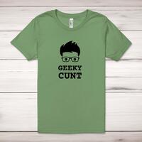 Geeky Cunt Adult T-Shirt\nA rude adult t-shirt with "Geeky Cunt" printed across the front of a 100% cotton* t-shirt. This rude t-shirt is great as a gift for any occasion.\nAll of our adult t-shirts are designed and hand-printed in the UK and are manufactured from quality 100% pre-shrunk jersey cotton knit for substantial softness and comfort. When quality, durability and substance count, this is the tee everyone can agree on. Featuring a crew neck, short sleeves, twin needle sleeve and bottom hems and unisex sizing. Available in sizes Extra Small to 5XL*.\n\n*Black & White tees available in sizes XS - 5XL, all other colours available XS - 2XL\n\nSize Guide\nUnisex adult t-shirts are measured around the chest, in inches\n\nXS 32/34"\nS 34/36"\nM 38/40"\nL 42/44"\nXL 46/48"\n2XL 50/52"\n3XL 54/56"\n4XL 58/60"5XL 62/64"\n\nSee more on our clothing size guide (opens in new tab)\n\n\nPlease Note\nAll of our t-shirts are hand-printed to order, as a result, colours may vary between prints - images are for illustration purposes only.\n\n