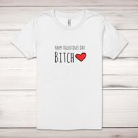 Happy Valentines Day Swearing Adult T-Shirt\nA rude adult t-shirt with a cute heart graphic and “Happy Valentines Day ...” choose from cunt, bitch or wanker printed across the front of a 100% cotton* t-shirt. This rude t-shirt is great as a gift for any occasion.\nIf you'd like another swear word not listed above, let us know in your order notes.\nAll of our adult t-shirts are designed and hand-printed in the UK and are manufactured from quality 100% pre-shrunk jersey cotton knit for substantial softness and comfort. When quality, durability and substance count, this is the tee everyone can agree on. Featuring a crew neck, short sleeves, twin needle sleeve and bottom hems and unisex sizing. Available in sizes Extra Small to 5XL*. *Black & White tees available in sizes XS - 5XL, all other colours available XS - 2XL \n\nSize Guide\nUnisex adult t-shirts are measured across the chest, in inches\n\nXS 30/32"\n S 34/36"\nM 38/40"\nL 42/44"\nXL 46/48"\n2XL 50/52"\n3XL 54/56"\n4XL 58/60"5XL 62/64"\n\n\nSee more on our clothing size guide (opens in new tab)\n\n\nPlease Note\nAll of our adult t-shirts are hand-printed to order, as a result, colours may vary between prints - images are for illustration purposes only.\n