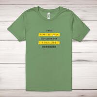 Happy Go Lucky Little Ray Of Fucking Sunshine Adult T-Shirt\nA rude unisex adult t-shirt with "I'm A Happy Go Lucky Little Ray Of Fucking Sunshine" printed across the front of a 100% cotton* t-shirt. This rude t-shirt is great as a gift for any occasion.\nAll of our adult t-shirts are designed and hand-printed in the UK and are manufactured from quality 100% pre-shrunk jersey cotton knit for substantial softness and comfort. When quality, durability and substance count, this is the tee everyone can agree on. Featuring a crew neck, short sleeves, twin needle sleeve and bottom hems and unisex sizing. Available in sizes Extra Small to 5XL*. *Black & White tees available in sizes XS - 5XL, all other colours available XS - 2XL \n\nSize Guide\nUnisex adult t-shirts are measured across the chest, in inches\n\nXS 30/32"\n S 34/36"\nM 38/40"\nL 42/44"\nXL 46/48"\n2XL 50/52"\n3XL 54/56"\n4XL 58/60"5XL 62/64"\n\n\nSee more on our clothing size guide (opens in new tab)\n\n\nPlease Note\nAll of our adult t-shirts are hand-printed to order, as a result, colours may vary between prints - images are for illustration purposes only.\n