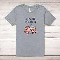 Like Mother Adult T-Shirt\nA rude adult t-shirt with "Like Mother Like Daughter (Oh Shit)" printed across the front of a 100% cotton* t-shirt. This rude t-shirt is great as a gift for any occasion.\nAll of our adult t-shirts are designed and hand-printed in the UK and are manufactured from quality 100% pre-shrunk jersey cotton knit for substantial softness and comfort. When quality, durability and substance count, this is the tee everyone can agree on. Featuring a crew neck, short sleeves, twin needle sleeve and bottom hems and unisex sizing. Available in sizes Extra Small to 5XL*.\n\n*Black & White tees available in sizes XS - 5XL, all other colours available XS - 2XL\n\nSize Guide\nUnisex adult t-shirts are measured around the chest, in inches\n\nXS 32/34"\nS 34/36"\nM 38/40"\nL 42/44"\nXL 46/48"\n2XL 50/52"\n3XL 54/56"\n4XL 58/60"5XL 62/64"\n\nSee more on our clothing size guide (opens in new tab)\n\n\nPlease Note\nAll of our t-shirts are hand-printed to order, as a result, colours may vary between prints - images are for illustration purposes only.\n\n