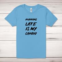 Running Late Adult T-Shirt\nA novelty unisex adult t-shirt with "Running Late Is My Cardio" printed across the front of a 100% cotton* t-shirt. This novelty t-shirt is great as a gift for any occasion.\nAll of our adult t-shirts are designed and hand-printed in the UK and are manufactured from quality 100% pre-shrunk jersey cotton knit for substantial softness and comfort. When quality, durability and substance count, this is the tee everyone can agree on. Featuring a crew neck, short sleeves, twin needle sleeve and bottom hems and unisex sizing. Available in sizes Extra Small to 5XL*.\n\n*Black & White tees available in sizes XS - 5XL, all other colours available XS - 2XL\n\nSize Guide\nUnisex adult t-shirts are measured around the chest, in inches\n\nXS 32/34"\nS 34/36"\nM 38/40"\nL 42/44"\nXL 46/48"\n2XL 50/52"\n3XL 54/56"\n4XL 58/60"5XL 62/64"\n\nSee more on our clothing size guide (opens in new tab)\n\n\nPlease Note\nAll of our adult t-shirts are hand-printed to order, as a result, colours may vary between prints - images are for illustration purposes only.\n