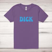 Blue Dick Adult T-Shirt\nA rude unisex adult t-shirt with "DICK" in a blue bold font printed across the front of a 100% cotton* t-shirt. This rude t-shirt is great as a gift for any occasion.\nAll of our adult t-shirts are designed and hand-printed in the UK and are manufactured from quality 100% pre-shrunk jersey cotton knit for substantial softness and comfort. When quality, durability and substance count, this is the tee everyone can agree on. Featuring a crew neck, short sleeves, twin needle sleeve and bottom hems and unisex sizing. Available in sizes Extra Small to 5XL*.\n\n*Black & White tees available in sizes XS - 5XL, all other colours available XS - 2XL\n\nSize Guide\nUnisex adult t-shirts are measured around the chest, in inches\n\nXS 32/34"\nS 34/36"\nM 38/40"\nL 42/44"\nXL 46/48"\n2XL 50/52"\n3XL 54/56"\n4XL 58/60"5XL 62/64"\n\nSee more on our clothing size guide (opens in new tab)\n\n\nPlease Note\nAll of our adult t-shirts are hand-printed to order, as a result, colours may vary between prints - images are for illustration purposes only.\n