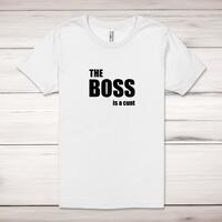 The Boss Is A ... Swearing Adult T-Shirt\nA rude adult t-shirt with “The Boss Is A ..." and your choice of swear word printed across the front of a 100% cotton* t-shirt. This rude t-shirt is great as a gift for any occasion.\nIf you'd like another swear word not listed above, let us know in your order notes.\nAll of our adult t-shirts are designed and hand-printed in the UK and are manufactured from quality 100% pre-shrunk jersey cotton knit for substantial softness and comfort. When quality, durability and substance count, this is the tee everyone can agree on. Featuring a crew neck, short sleeves, twin needle sleeve and bottom hems and unisex sizing. Available in sizes Extra Small to 5XL*. *Black & White tees available in sizes XS - 5XL, all other colours available XS - 2XL \n\nSize Guide\nUnisex adult t-shirts are measured across the chest, in inches\n\nXS 30/32"\n S 34/36"\nM 38/40"\nL 42/44"\nXL 46/48"\n2XL 50/52"\n3XL 54/56"\n4XL 58/60"5XL 62/64"\n\n\nSee more on our clothing size guide (opens in new tab)\n\n\nPlease Note\nAll of our adult t-shirts are hand-printed to order, as a result, colours may vary between prints - images are for illustration purposes only.\n