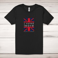 I Voted Leave Idiot Adult T-Shirt\nA rude adult t-shirt with "I voted leave beacuse I am a fucking idiot" printed across the front of a 100% cotton* unisex t-shirt. This rude t-shirt is great as a gift for any occasion.\nAll of our adult t-shirts are designed and hand-printed in the UK and are manufactured from quality 100% pre-shrunk jersey cotton knit for substantial softness and comfort. When quality, durability and substance count, this is the tee everyone can agree on. Featuring a crew neck, short sleeves, twin needle sleeve and bottom hems and unisex sizing. Available in sizes Extra Small to 5XL*.\n\n*Black & White tees available in sizes XS - 5XL, all other colours available XS - 2XL\n\nSize Guide\nUnisex adult t-shirts are measured around the chest, in inches\n\nXS 32/34"\nS 34/36"\nM 38/40"\nL 42/44"\nXL 46/48"\n2XL 50/52"\n3XL 54/56"\n4XL 58/60"\n5XL 62/64"\n\nSee more on our clothing size guide (opens in new tab)\n\n\nPlease Note\nAll of our adult t-shirts are hand-printed to order, as a result, colours may vary between prints - images are for illustration purposes only.\n