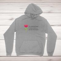 I'm A Delicate Flower Hoodie\nA rude hoodie with "I'm a delicate flower. A needy, fucked up delicate little flower." printed on the front of a unisex pullover hooded sweatshirt. Simple and straight to the point this rude hoodie is great as a\n gift for any occasion.\nComfortable and cosy, this hoodie manages to be both warm and cool. The super soft feel and plush fabric is\n definitely something you’ll want to warm up to. All of our garments are designed and hand-printed in the UK and are\n manufactured from preshrunk fleece knit and features a double-lined hood, and colour-matched drawcord, pouch pocket\n and a tubular body that has been quarter turned to avoid a centre crease; available in sizes small to 5XL.\n\n Classic fit\n Preshrunk fleece knit\n Air jet yarn = softer feel and reduced pilling\n Double-lined hood with colour-matched drawcord\n Pouch pocket\n Twin-needle stitching at shoulder, armhole, neck, waistband and cuffs\n 1 x 1 rib with elastane\n Quarter-turned to eliminate centre crease\n Material Weight 271gsm\n 50% Cotton / 50% Polyester\n\nSize Guide\nmeasured across the chest\n\n S 34/36"\n M 38/40"\n L 42/44"\n XL 46/48"\n 2XL 50/52"\n 3XL 54/56"\n 4XL 58/60"\n 5XL 62/64"\n\nSee more on our clothing size guide (opens in new tab)\n\n Please Note\n All of our items are hand-printed to order, as a result, colours may vary between prints - images are for\n illustration purposes only.\n