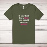 If You Think I'm a Bitch Adult T-Shirt\nA rude unisex adult t-shirt with "If you think I'm a bitch you should meet my ..." choose from either sister or mother printed across the front of a 100% cotton* t-shirt. This rude t-shirt is great as a gift for any occasion.\n Select Design 1 for sister or Design 2 for mother, or if you would like anything different please add it to the notes section. \nAll of our adult t-shirts are designed and hand-printed in the UK and are manufactured from quality 100% pre-shrunk jersey cotton knit for substantial softness and comfort. When quality, durability and substance count, this is the tee everyone can agree on. Featuring a crew neck, short sleeves, twin needle sleeve and bottom hems and unisex sizing. Available in sizes Extra Small to 5XL*. *Black & White tees available in sizes XS - 5XL, all other colours available XS - 2XL \n\nSize Guide\nUnisex adult t-shirts are measured across the chest, in inches\n\nXS 30/32"\n S 34/36"\nM 38/40"\nL 42/44"\nXL 46/48"\n2XL 50/52"\n3XL 54/56"\n4XL 58/60"5XL 62/64"\n\n\nSee more on our clothing size guide (opens in new tab)\n\n\nPlease Note\nAll of our adult t-shirts are hand-printed to order, as a result, colours may vary between prints - images are for illustration purposes only.\n