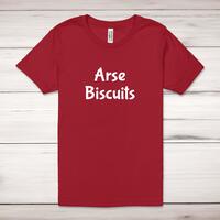 Arse Biscuits Adult T-Shirt\nA rude adult t-shirt with "Arse Biscuits" printed across the front of a 100% cotton* t-shirt. This rude t-shirt is great as a gift for any occasion.\nAll of our adult t-shirts are designed and hand-printed in the UK and are manufactured from quality 100% pre-shrunk jersey cotton knit for substantial softness and comfort. When quality, durability and substance count, this is the tee everyone can agree on. Featuring a crew neck, short sleeves, twin needle sleeve and bottom hems and unisex sizing. Available in sizes Extra Small to 5XL*.\n *Black & White tees available in sizes XS - 5XL, all other colours available XS - 2XL \n\nSize Guide\nUnisex adult t-shirts are measured across the chest, in inches\n\n\nXS 30/32"\n\nS 34/36"\n\nM 38/40"\n\nL 42/44"\n\nXL 46/48"\n\n2XL 50/52"\n\n3XL 54/56"\n4XL 58/60"5XL 62/64"\n\nSee more on our clothing size guide (opens in new tab)\n\n\nPlease Note\nAll of our t-shirts are hand-printed to order, as a result, colours may vary between prints - images are for illustration purposes only.\n\n
