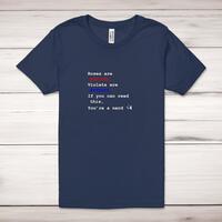 Roses Are #ff0000 Adult T-Shirt\nA geeky unisex adult t-shirt with "Roses Are #ff0000" printed across the front of a 100% cotton* t-shirt. This geeky t-shirt is great as a gift for any occasion.\nAll of our adult t-shirts are designed and hand-printed in the UK and are manufactured from quality 100% pre-shrunk jersey cotton knit for substantial softness and comfort. When quality, durability and substance count, this is the tee everyone can agree on. Featuring a crew neck, short sleeves, twin needle sleeve and bottom hems and unisex sizing. Available in sizes Extra Small to 5XL*.\n\n*Black & White tees available in sizes XS - 5XL, all other colours available XS - 2XL\n\nSize Guide\nUnisex adult t-shirts are measured around the chest, in inches\n\nXS 32/34"\nS 34/36"\nM 38/40"\nL 42/44"\nXL 46/48"\n2XL 50/52"\n3XL 54/56"\n4XL 58/60"5XL 62/64"\n\nSee more on our clothing size guide (opens in new tab)\n\n\nPlease Note\nAll of our adult t-shirts are hand-printed to order, as a result, colours may vary between prints - images are for illustration purposes only.\n
