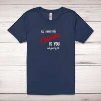 All I Want For Christmas Adult T-Shirt\nA rude adult t-shirt with "All I Want For Christmas Is You and your big..." choose from cock or tits printed across the front of a 100% cotton* t-shirt. This rude t-shirt is great as a gift for any occasion.\nAll of our adult t-shirts are designed and hand-printed in the UK and are manufactured from quality 100% pre-shrunk jersey cotton knit for substantial softness and comfort. When quality, durability and substance count, this is the tee everyone can agree on. Featuring a crew neck, short sleeves, twin needle sleeve and bottom hems and unisex sizing. Available in sizes Extra Small to 5XL*.\n *Black & White tees available in sizes XS - 5XL, all other colours available XS - 2XL \n\nSize Guide\nUnisex adult t-shirts are measured across the chest, in inches\n\nXS 30/32"\nS 34/36"\nM 38/40"\nL 42/44"\nXL 46/48"\n2XL 50/52"\n3XL 54/56"\n4XL 58/60"5XL 62/64"\n\nSee more on our clothing size guide (opens in new tab)\n\n\nPlease Note\nAll of our t-shirts are hand-printed to order, as a result, colours may vary between prints - images are for illustration purposes only.\n\n