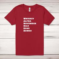 Whiskey Alpha Adult T-Shirt\nA rude adult t-shirt with "Whiskey Alpha November Kilo Echo Romeo", from the NATO phonetic alphabet printed across the front of a 100% cotton* t-shirt. This rude t-shirt is great as a gift for any occasion.\nAll of our adult t-shirts are designed and hand-printed in the UK and are manufactured from quality 100% pre-shrunk jersey cotton knit for substantial softness and comfort. When quality, durability and substance count, this is the tee everyone can agree on. Featuring a crew neck, short sleeves, twin needle sleeve and bottom hems and unisex sizing. Available in sizes Extra Small to 5XL*.\n\n*Black & White tees available in sizes XS - 5XL, all other colours available XS - 2XL\n\nSize Guide\nUnisex adult t-shirts are measured around the chest, in inches\n\nXS 32/34"\nS 34/36"\nM 38/40"\nL 42/44"\nXL 46/48"\n2XL 50/52"\n3XL 54/56"\n4XL 58/60"\n5XL 62/64"\n\nSee more on our clothing size guide (opens in new tab)\n\n\nPlease Note\nAll of our t-shirts are hand-printed to order, as a result, colours may vary between prints - images are for illustration purposes only.\n\n
